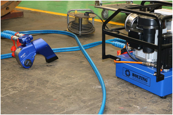2、所有高精度設(shè)備,在螺栓終緊過(guò)程中,都應(yīng)該是對(duì)角或者四角施加扭矩,避免受力不均勻造成的法蘭變形或者密封受損,避免泄露,如采用電動(dòng)扭矩扳手或者氣動(dòng)扭矩扳手,需要兩個(gè)操作工程師用兩把電動(dòng)扭矩扳手對(duì)螺栓進(jìn)行擰緊工作,時(shí)機(jī)配合等都需要相當(dāng)默契,那么四同步的情況下呢?成本相對(duì)于液壓扳手來(lái)說(shuō)更高,采用液壓扳手則避免了這個(gè)問(wèn)題,配置的電動(dòng)液壓泵為四同步,同一臺(tái)動(dòng)力源,不可能一臺(tái)扳手是50Mpa,另一臺(tái)48Mpa,后期有需要增加到四同步,僅需再配兩把液壓扳手和套筒即可,無(wú)需再購(gòu)買(mǎi)液壓泵站。