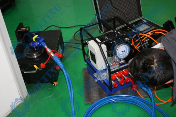 液壓扭力扳手第三方扭矩校驗(yàn)檢測,理論上液壓扭力扳手檢測標(biāo)定與液壓泵的型號(hào)和流量無關(guān),液壓扭力扳手泵經(jīng)過校正壓力表,均可對液壓扭力扳手進(jìn)行檢測,經(jīng)過長期及大量的實(shí)踐證明,液壓泵的流量與扭矩大小息息相關(guān),舉例說明,BOLTING博霆PE55液壓扭力扳手泵和BOLTING博霆PE110液壓扭力扳手泵,采用同一塊經(jīng)過校驗(yàn)壓力表,分先后順序緊固一顆螺栓,由PE55液壓扭力扳手泵配套液壓扭力扳手先進(jìn)行緊固,達(dá)到設(shè)定壓力后(300bar),擰不動(dòng)了,換PE110液壓扭力扳手泵,壓力同樣設(shè)定300bar,壓力相同,螺栓同樣可以轉(zhuǎn)動(dòng),反之,采用PE55液壓扭力扳手泵,配合此扳手,壓力設(shè)定到300bar,確無法松動(dòng)螺栓,配PE110液壓扭力扳手泵可輕松拆卸此螺栓,得出結(jié)論,液壓扭力扳手在工作過程中,需克服摩擦力,雖然液壓扭力扳手無沖擊性,但流量決定可以克服多少摩擦力,液壓扭力扳手怎樣檢測更精準(zhǔn)?市場上部分廠家流量與扭矩存在虛標(biāo)成分(電動(dòng)液壓泵流量檢測最簡單方式,可采用單向閥裝置連接液壓油管,將液壓泵調(diào)整至所需檢測的壓力流量,每分鐘溢出的油量則是液壓泵流量,測流量裝置BOLTING博霆有售),計(jì)量院或第三方檢測機(jī)構(gòu)所采用的液壓泵型號(hào)不盡相同,采用購買液壓扭力扳手配套的電動(dòng)液壓扭力扳手泵,配套進(jìn)行檢測更為精確。