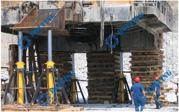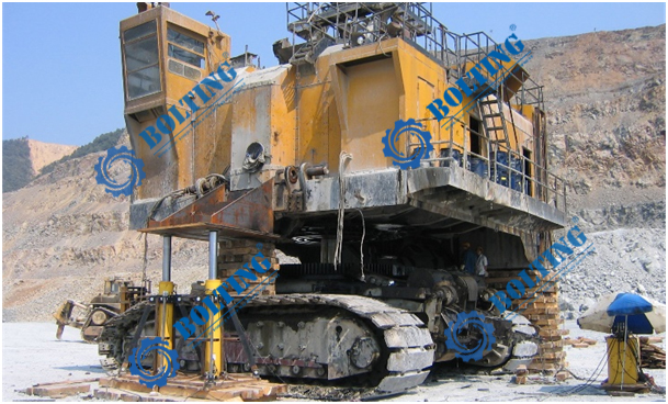 已知所需頂升設(shè)備為礦用電鏟,對電鏟進(jìn)行回轉(zhuǎn)支承維護等工作,總重量約為1000噸,需更換履帶行走裝置、回轉(zhuǎn)裝置等部件,就需要將整機同步頂升,平穩(wěn)的頂起到一定的高度,便于現(xiàn)場的檢修,頂升過程中需保證不損壞整機結(jié)構(gòu),也需使其均衡受力。
